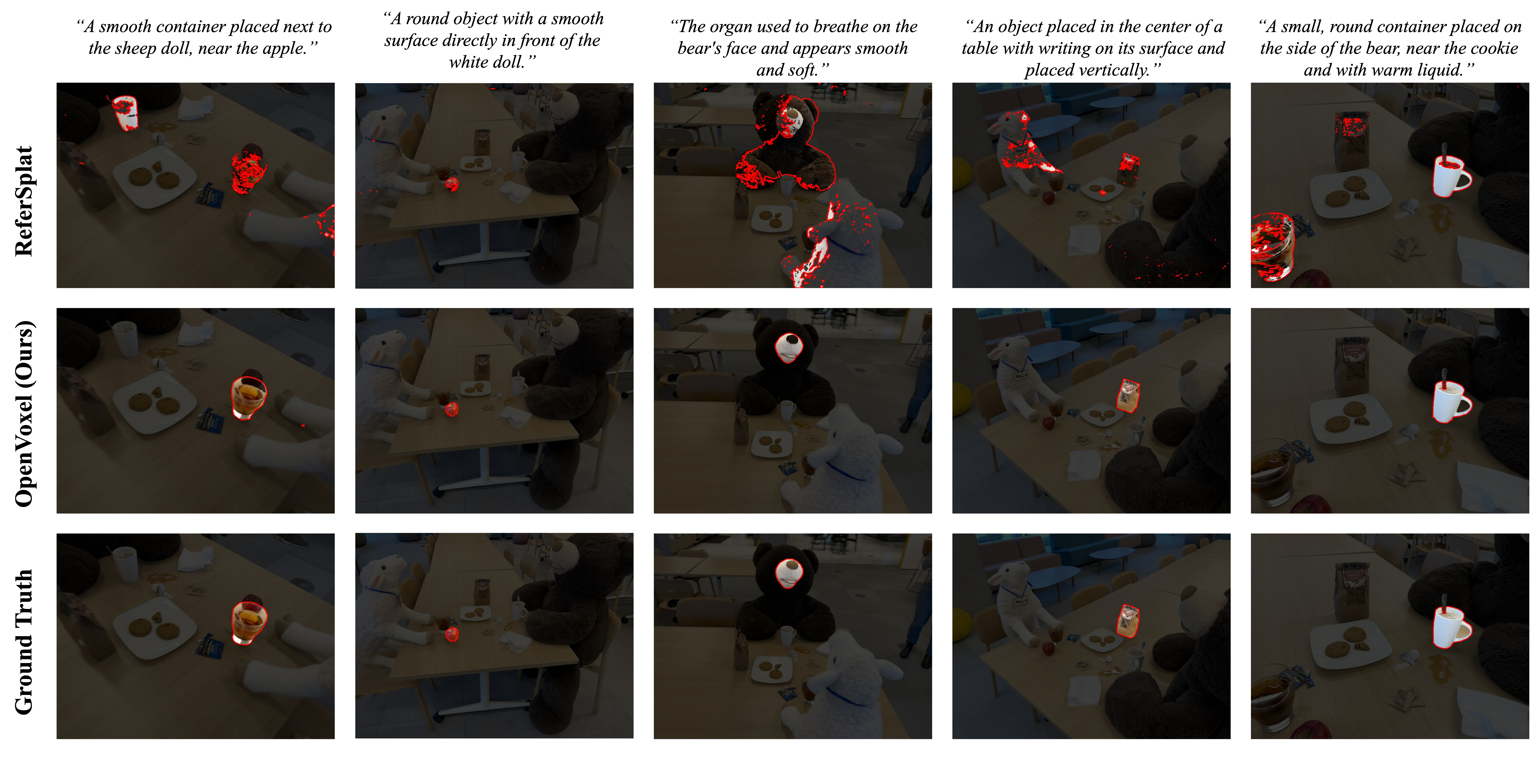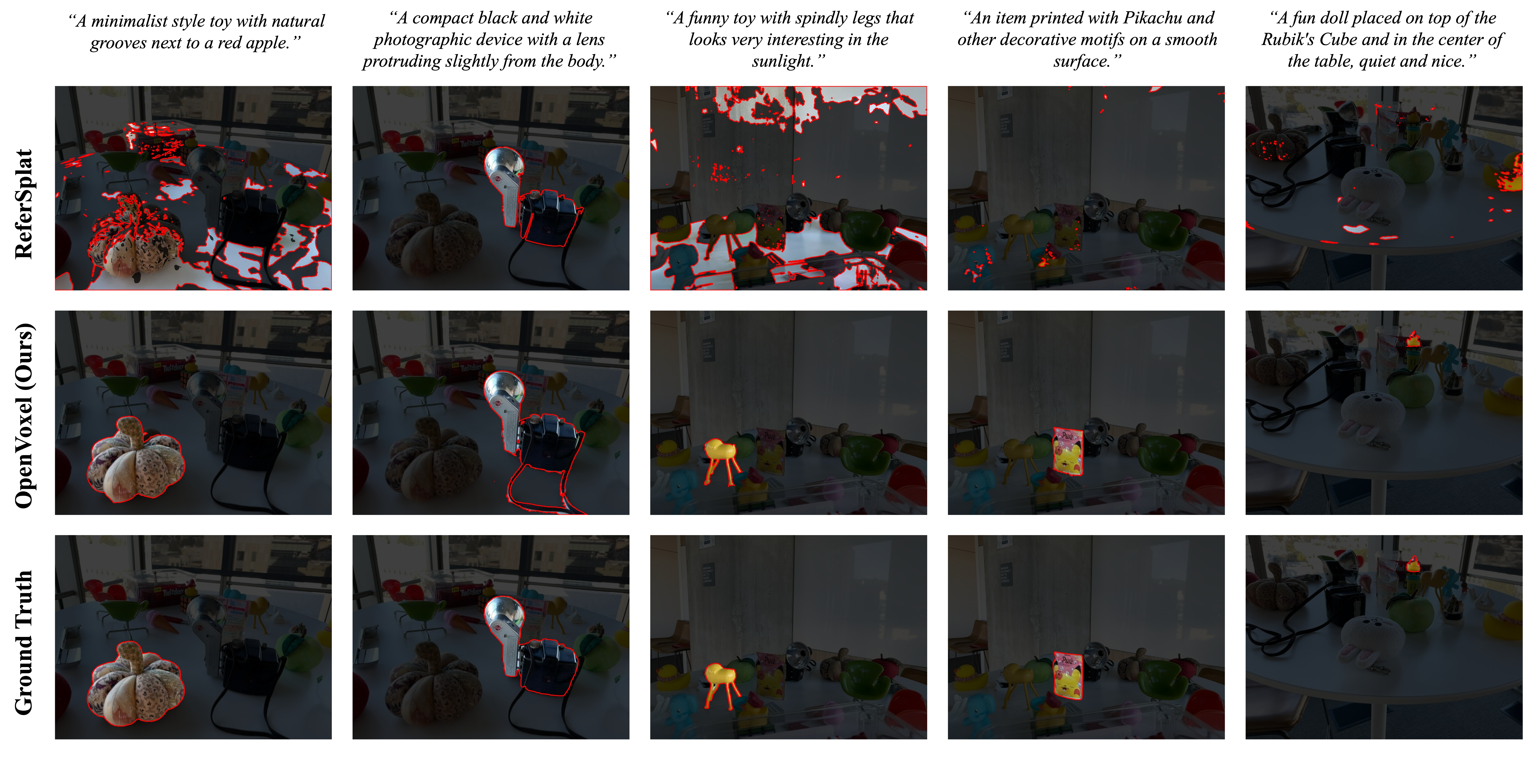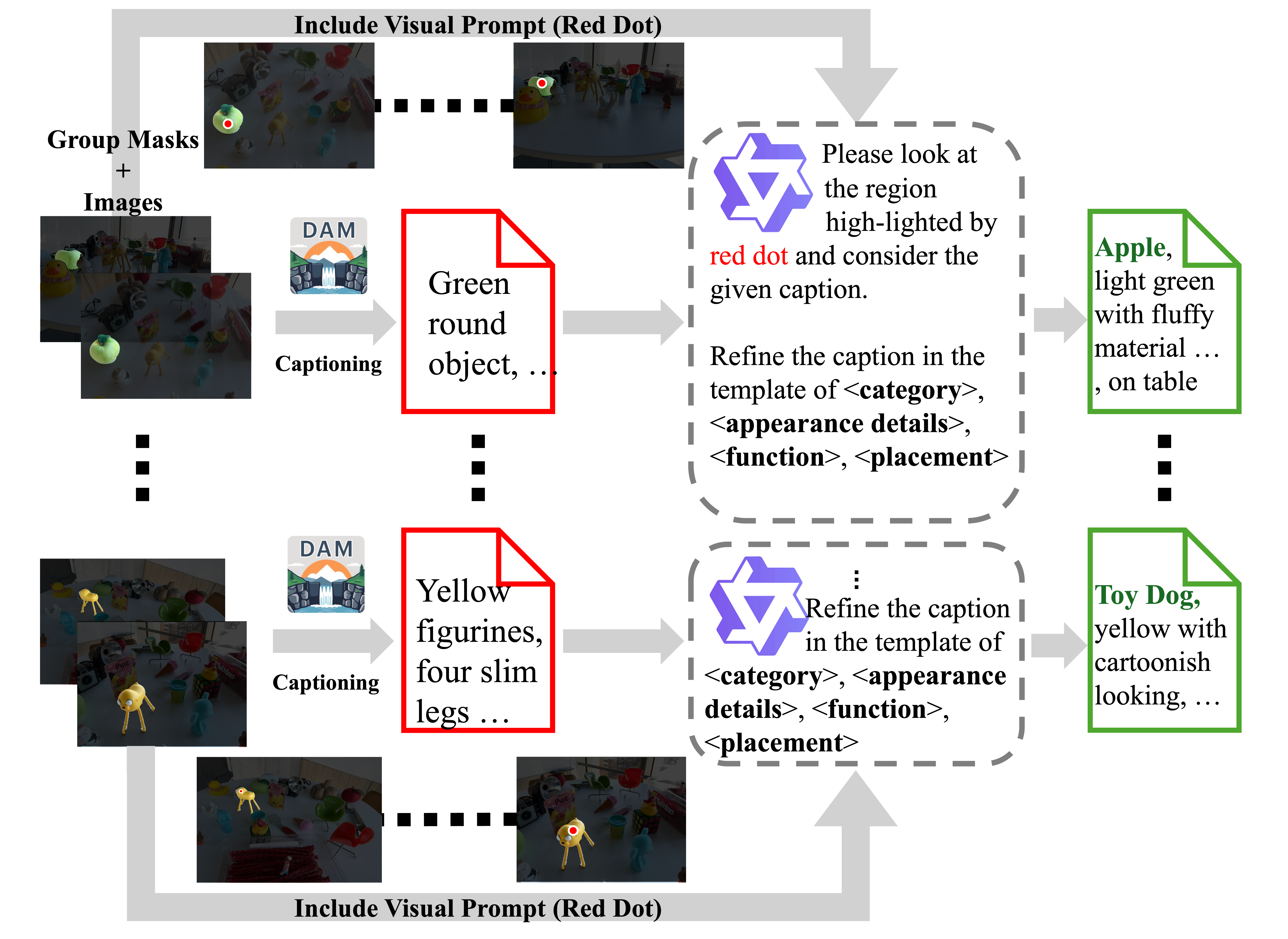 Given the group masks rendered of a specific group (taking the green apple as example) from our group field and their corresponding images, we leverage the Describe Anything Model (DAM) to first obtain a detailed caption. Then a Qwen3-VL model is conducted to canonicalize the caption into a fixed form, benefiting further usage.